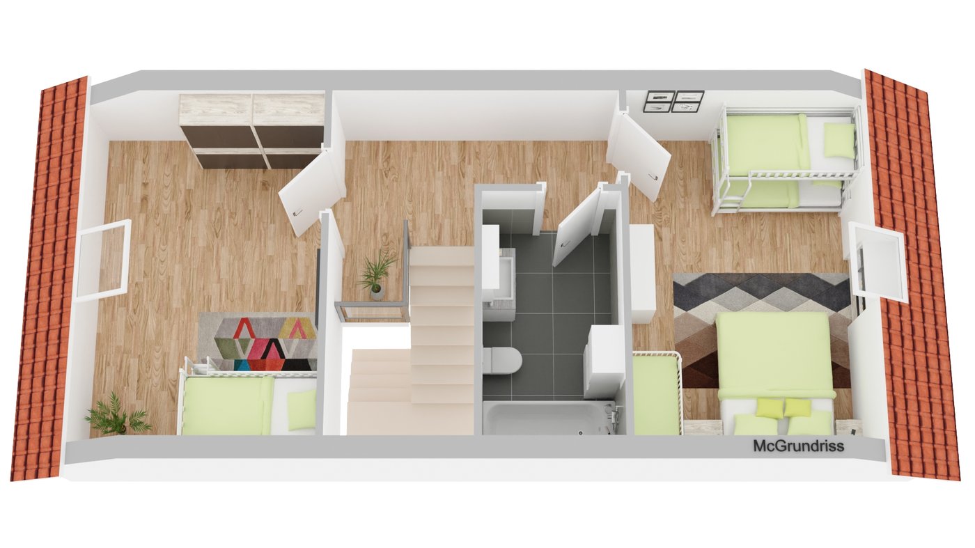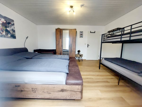 Hier befindet sich ein Doppelbett und darüber schwebt ein Einzelbett. Zusammen ergibt sich daraus ein Etagenbett. Ein Schrank zur Aufbewahrung eurer Kleidungsstücke sowie ein Nachtisch und ein großer Spiegel befinden sich ebenfalls in diesem Zimmer. Das Zimmer befindet sich im OG gleich neben dem Bad.