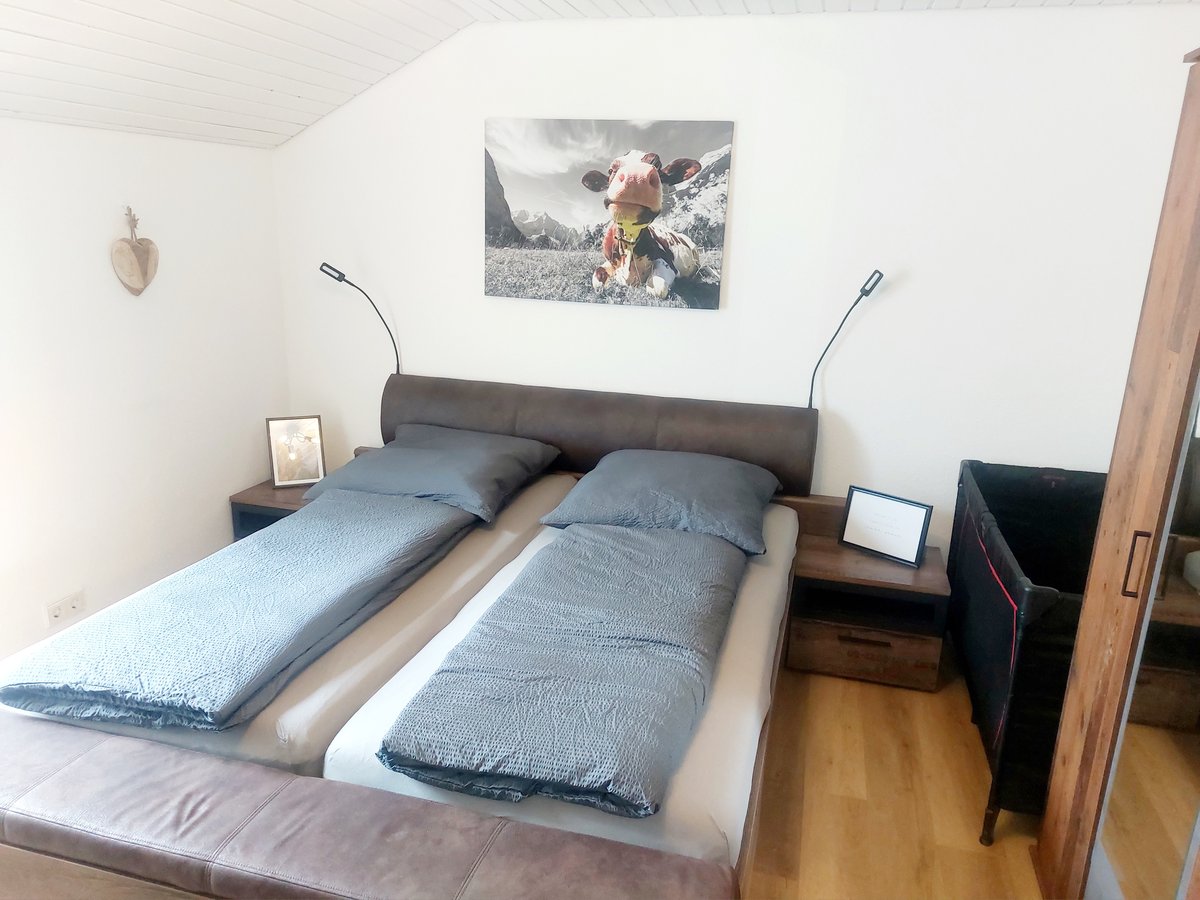 Hier befinden sich ein großes Doppelbett und ein weiteres Etagenbett. Ein Schrank mit Spiegel und Nachtischen stehen für euch bereit. Das Zimmer ist ebenfalls im OG und gleich neben dem Bad. Für die Allerkleinsten steht ein Babybett bereit.